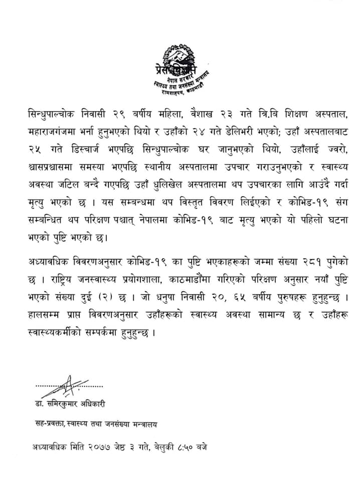 स्वास्थ्य मन्त्रालयद्वारा आज साँझ जारी बिज्ञप्तिमा ति महिला बैशाख २३ गते शिक्षण अस्पतालमा भर्ना भएको बैशाख २४ गते सामान्य अवस्थामा डेलिभरी भएकी र २५ गते बाह्रबिसेस्थित घरमा फर्केकी महिलाको मृत्यु भएको पुष्टि गरेको हो । साथै मन्त्रालयले कोरोना संक्रमितको कूल संख्या २८१ पुगेको जनाएको छ । शनिबार थप चार जनाको पुष्टिसँगै कूल १३ जना संक्रमित भेटिएका छन् । थप संक्रमित काभ्रे, धुनषा लगायतका छन् ।