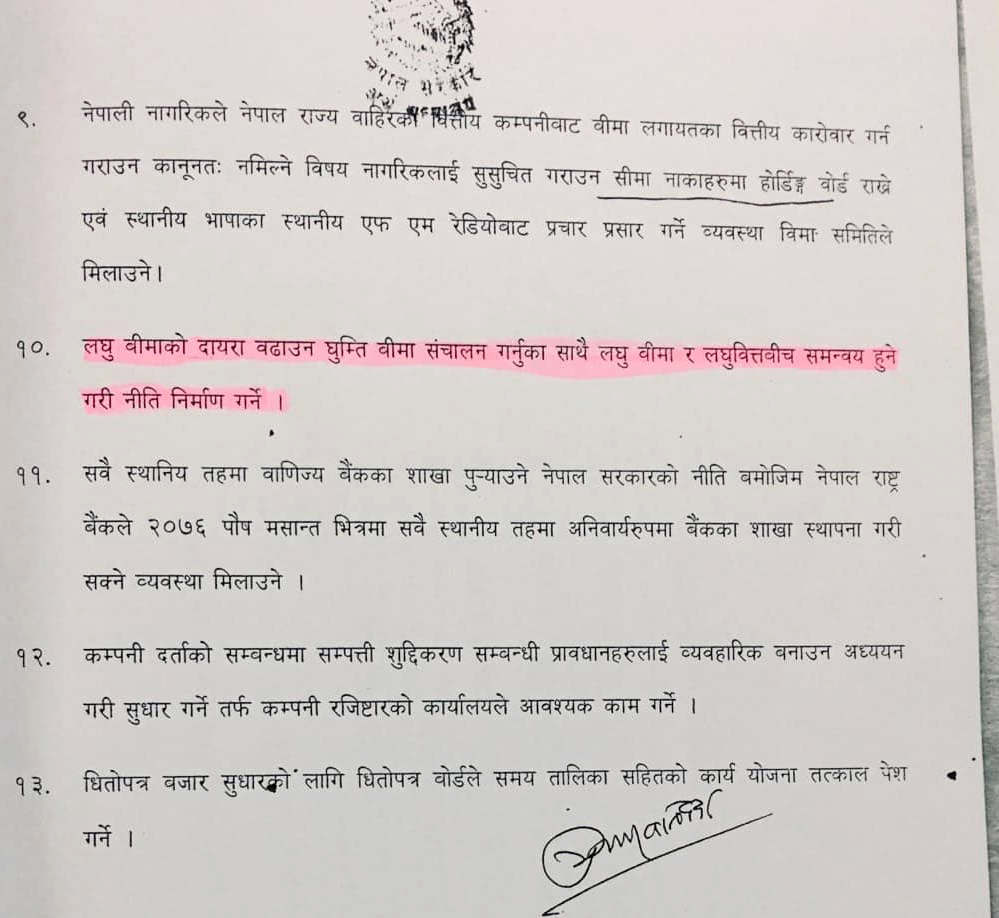साथै सोही बैठकले बीमा समितिले लघुबीमा, घुम्ती बीमा सेवा लगायतका बीमा सम्बन्धी जनचेतना फैलाउने कार्य गर्न समेत निर्देशन दिएको थियो ।