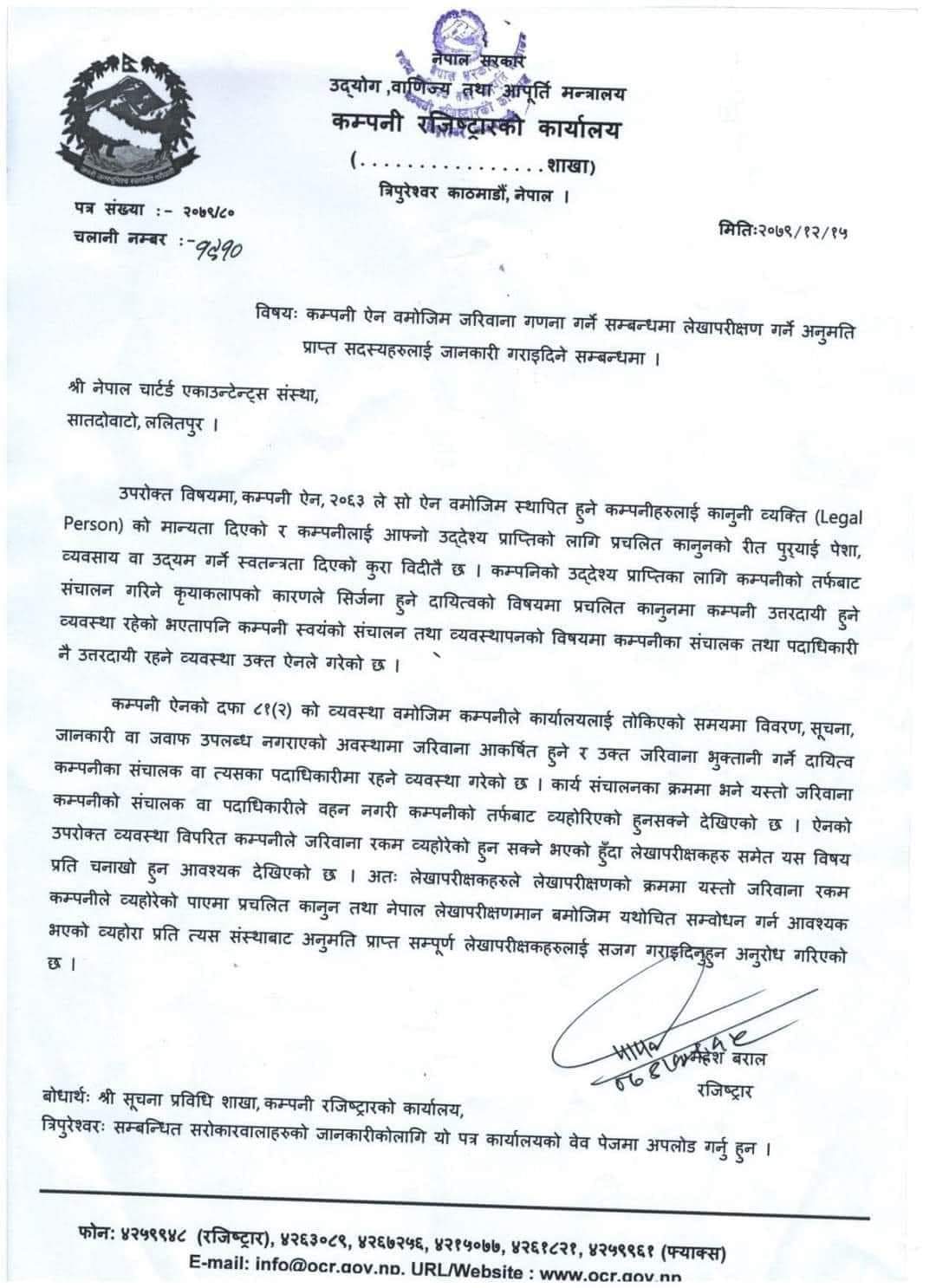 कम्पनी ऐन २०६३ बमोजिम स्थापित हुने कम्पनीहरुलाई कानुनी व्यक्तिको मान्यता दिएको छ । कम्पनीको आफ्नो उद्देश्य प्राप्तिका लागि प्रचलित कानुनको रीत पुर्याई पेशा, व्यवसाय वा उद्यम गर्ने स्वतन्त्र दिइएको छ । कम्पनीको उद्देश्य प्राप्तिका लागि कम्पनीको तर्फबाट संचालन गरिने क्रियाकलापको कारणले सिर्जना हुने दायित्वको विषयमा प्रचलित कानुनमा कम्पनी उत्तरदायी हुने व्यवस्था रहेको भएतापनि कम्पनी स्वयंको संचालन तथा व्यवस्थापनको विषयमा कम्पनीका संचालक तथा पदाधिकारी नै उत्तरदायी रहने व्यवस्था ऐनमा रहेको कम्पनी रजिष्ट्रारको कार्यालयले जनाएको छ । लेखापरीक्षणका क्रममा यस्ता विषयमा चनाखो अपनाउन लेखापरीक्षकलाई कम्पनी रजिष्ट्रारको कार्यालयले अनुरोध गरेको हो ।