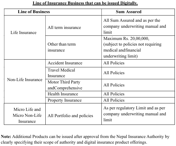 प्राधिकरणले डिजिटल माध्यमबाट जारी हुने बीमालेखका लागि जीवन बीमा, निर्जीवन बीमा र लघु जीवन र निर्जीवन बीमा कम्पनीलाई मापदण्ड तोकिएको छ। त्यस्तै प्राधिकरणको स्वीकृतिमा बीमकले नयाँ प्रडक्ट पनि डिजिटल माध्यमबाट जारी गर्न पाउने भएका छन्।
