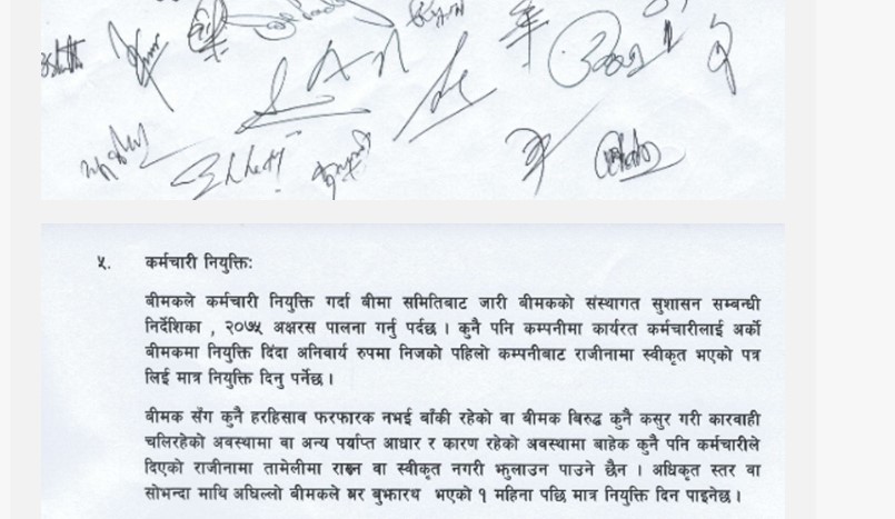 उता, युनाईटेड इन्स्योरेन्सले बीमा समिति र बीमक संघलाई समेत सम्बोधन गरी संहिता उल्लंघन भएको भन्दै पत्र लेखिसकेको छ । बीमक संघले प्राप्त उजुरीमाथि छानविन गरी कारवाही गर्ने प्रावधान छ । बीमक संघले जारी गरेको आचार संहिताको पाँचौं नम्बरको बुँदामा अधिकृत वा सो भन्दा माथिका कर्मचारीलाई अर्को कम्पनीले नियुक्ती दिँदा एक महिनाको कुलिङ पिरियड लाग्ने अनिवार्य व्यवस्था गरिएको छ । तर, जनरल इन्स्योरेन्समा एचआर प्रमुखमा नियुक्त भएकी रेमिना मानन्धर असोज ४ गतेसम्म युनाईटेड इन्स्योरेन्समा हाजिर गरेर तलब लिई असोज ५ गते जनरल इन्स्योरेन्स कम्पनीमा नियुक्ती लिई हाजिर भएको खुलेको छ । अझ रोचक कुरा त के छ भने मानन्धरले असोज ४ गतेसम्मको तलब युनाईटेड इन्स्योरेन्सबाट तलव बुझेकी थिईन् । यता जनरल इन्स्योरेन्स कम्पनीमा पुरानो मितिमा नियुक्ती लिएकी मानन्धरले असोज १ गतेदेखिकै तलब बुझेको बताइन्छ । सिईओ तमोटले समेत उनले असोज १ गतेदेखि नै तलब बुझेको स्वीकार गरेका छन् ।बीमक संघले जारी गरेको आचार संहिताको दोस्रो नम्बरको बुँदामा बीमा कम्पनीमा कार्यरत सम्पूर्ण कर्मचारीलाई समेत आफ्नो दायराभित्र राखेको छ । बीमा कम्पनीहरुले प्रतिस्पर्धी कम्पनीका राम्रा कर्मचारीलाई एक तह बढुवाई दिई नियुक्त गर्ने अस्वस्थ प्रतिस्पर्धा बढेपछि २० वटै निर्जिवन बीमा कम्पनीहरुका सिईओहरुको हस्ताक्षरसहित बीमक संघले आचार संहिता जारी गरेको थियो । आचार संहिता उल्लंघन गर्ने बीमा कम्पनीमाथि संघले छानविन गरी दोषी देखिए सफाई पेश गर्ने मौका दिई कारवाही गर्न सक्ने व्यवस्था छ ।