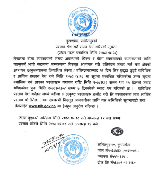 समितिले साउन २८ गते पहिलो पटक नेपालमा बीमा व्यवसायको समग्र अवस्थाको चित्रण र बीमा व्यवसायको व्यापकताको लागि चाल्नु पर्ने भावी कदमका सम्बन्धमा विस्तृत अध्ययन गरी प्रतिवेदन तयार गर्न यस क्षेत्रको अध्ययन अनुसन्धानमा क्रियाशिल संस्था प्रतिष्ठानहरुका लागि प्रस्ताव आह्वान गरेको थियो ।