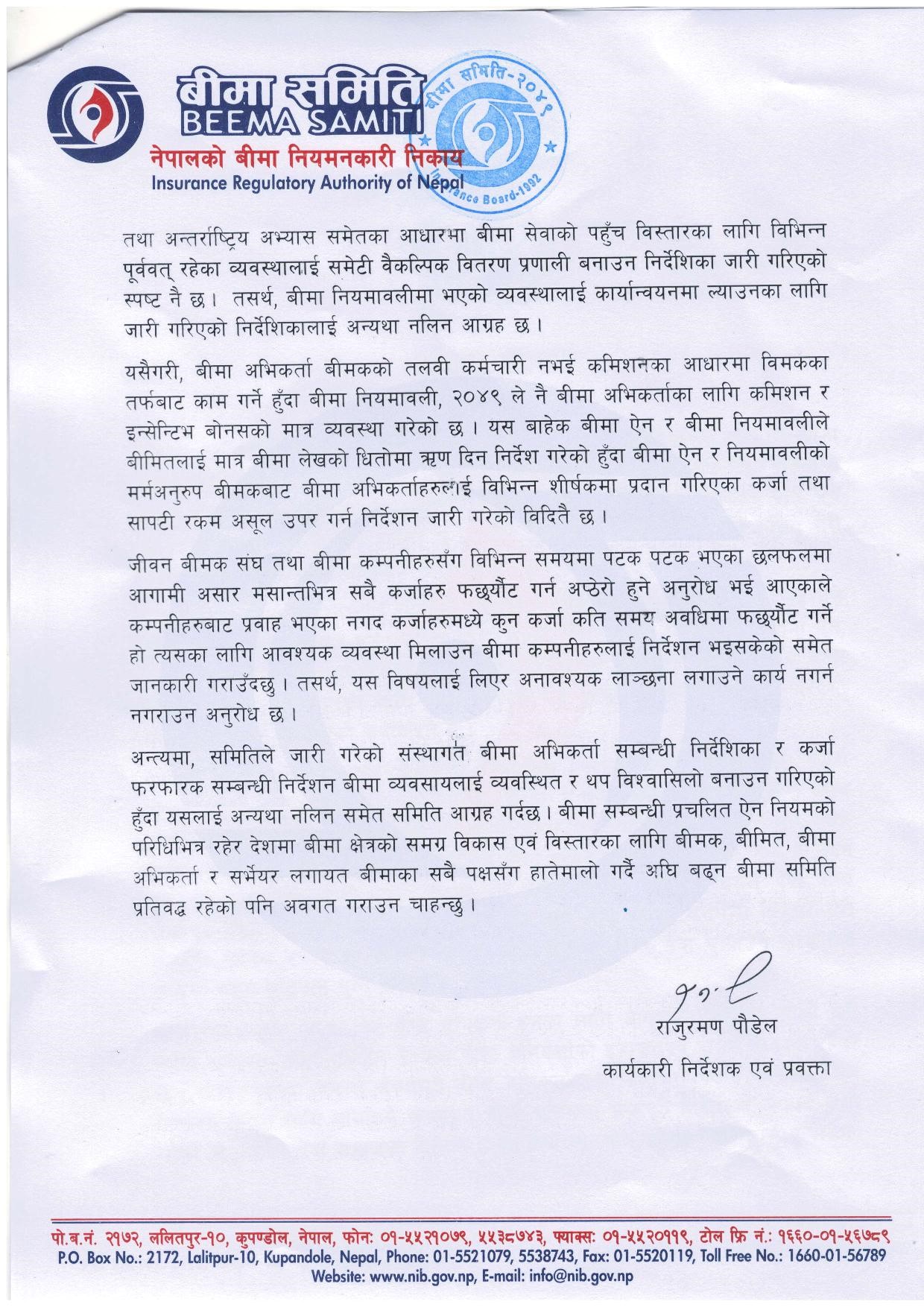अन्त्यमा, समितिले जारी गरेको संस्थागत बीमा अभिकर्ता सम्बन्धी निर्देशिका र कर्जा फरफारक सम्बन्धी निर्देशन बीमा व्यवसायलाई व्यवस्थित र थप विश्वासिलो बनाउन गरिएको हुँदा यसलाई अन्यथा नलिन समेत समिति आग्रह गर्दछ । बीमा सम्बन्धी प्रचलित ऐन नियमको परिधिभित्र रहेर देशमा बीमा क्षेत्रको समग्र विकास एवं विस्तारका लागि बीमक, बीमित, बीमा अभिकर्ता र सर्भेयर लगायत बीमाका सबै पक्षसँग हातेमालो गर्दै अघि बढ्न बीमा समिति प्रतिवद्ध रहेको छ ।