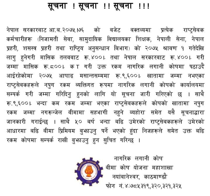 नेपाल सरकारबाट आव २०७५/७६ को बजेट वक्तब्यमा प्रत्येक राष्ट्रसेवकको कर्मचारीहरु (निजामती सेवा, सामुदायिक विद्यालयका शिक्षक, नेपाली सेना, नेपाल प्रहरी, शसस्त्र प्रहरी, तथा राष्ट्रिय अनुसन्धान विभाग) बीमा गरिने घोषणा गरेको थियो । जसका लागी २०७५ साल साउन १ गते देखि कर्मचारीको मासिक तलबबाट ४०० रुपैयाँ र नेपाल सरकारबाट ४०० रुपैयाँ गरी जम्मा ८०० सय रुपैयाँ नागरिक लगानीकोषमा जम्मा गर्दै आएको छ ।