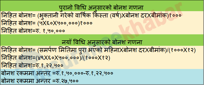 नयाँ गणना विधिका अनुसार बीमितले पाउने बोनश रकम रु. २७ हजार ५ सयले फरक छ । अर्थात पहिले र अहिलेको समर्पण मूल्यमा बीमितले प्राप्त गर्ने बोनश रकममा १८ प्रतिशत भन्दा बढीले फरक परेको छ ।