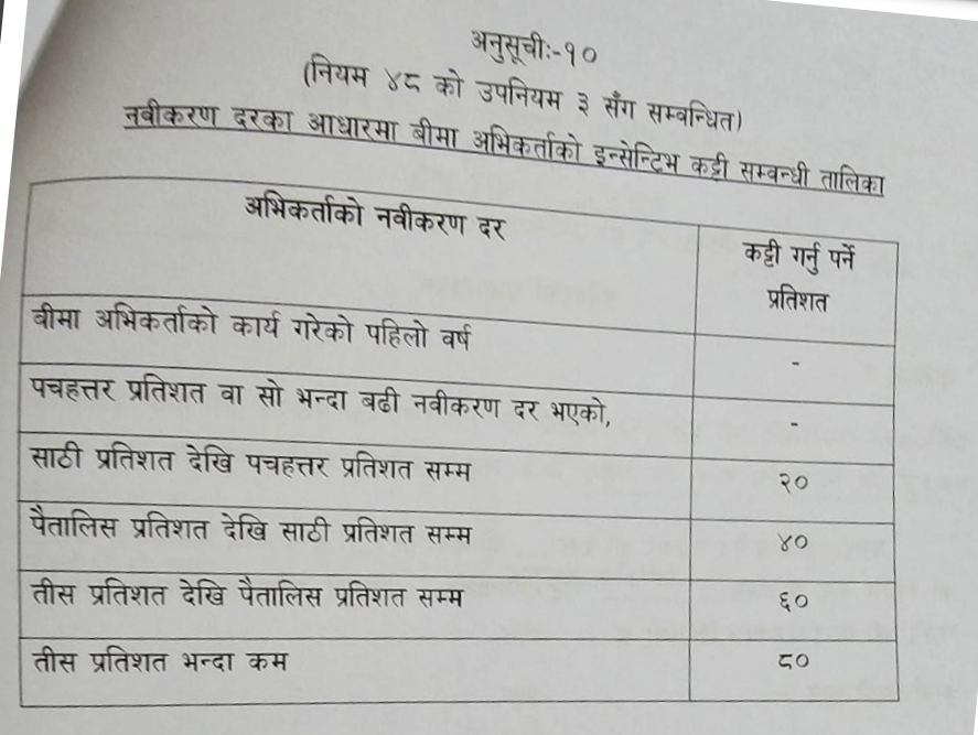 प्रस्तावित मस्यौदाकाे प्रावधान लागू भएकाे अवस्थामा बीमालेख जति बढी निष्कृय हुन्छ प्राेत्साहनवापतकाे रकम उति नै थोरै प्राप्त गर्नेछन् । सर्वसाधारणलाई झुक्याएर वा क्रय क्षमताकाे उपेक्षा गरेर कमिशनको लाेभमा ठूलाे बीमांकको बीमालेख जबरजस्ती भिडाउने प्रवृत्तीमा अंकुश लगाउनका लागी प्राधिकरणले बीमालेख नविकरण दरका आधारमा मात्र प्राेत्साहन रकम दिने प्रावधान लागू गर्न खोजेकाे हाे ।