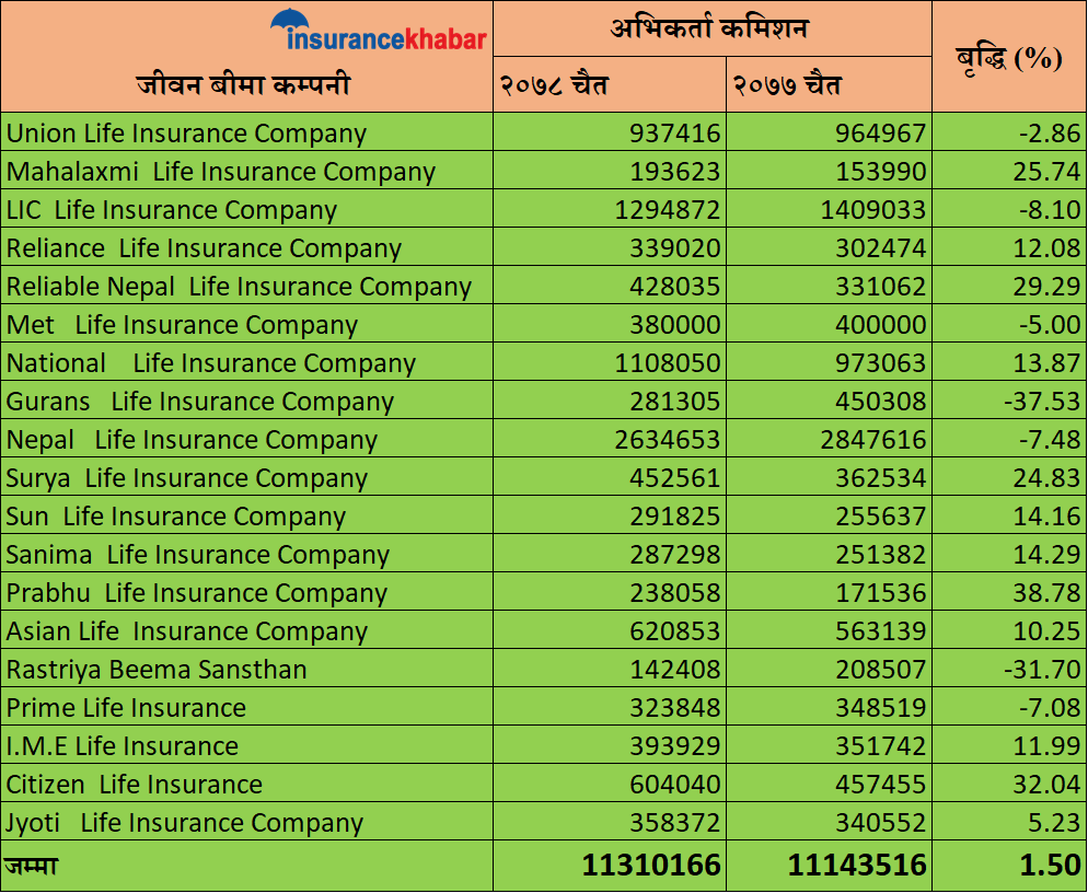 तेस्रो त्रैमाशिक अवधिमा सबैभन्दा धेरै कमिशन घट्नेमा गुराँस लाइफको ३७ प्रतिशत, राष्ट्रिय बीमा संस्थान ३१ प्रतिशत, एलआइसी ८ प्रतिशत, नेपाल लाइफ ७ प्रतिशतल र प्राइमको ७ प्रतिशतले घटेको छ । त्यस्तै सर्वाधिक धेरै कमिशन बढ्नेमा प्रभु लाइफको ३८ प्रतिशत, सिटिजन ३२ प्रतिशत, रिलायबनल २९ प्रतिशत, महालक्ष्मी लाइफ २५ प्रतिशत र सूर्या लाइफ २४ प्रतिशतले बढेको छ ।