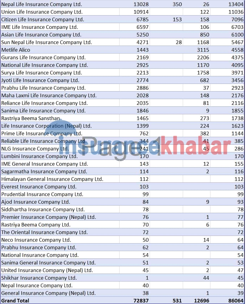 त्यस्तै युनियन लाइफका ११ हजार ३६ जना अभिकर्ताले नविकरण गरेका छन् । सिटिजन लाइफका ७ हजार ९६ जना, आइएमई लाइफ ७ हजार ९६ जना, एशियन लाइफका ६ हजार जना, सन नेपाल लाइफका ५ हजार ४६७ जना, मेट लाइफका ४ हजार ५५८ जना, गुराँस लाइफ ४ हजार ३७५ जना, नेशनल लाइफ ४ हजार ९५ जनाले नविकरण गरेका छन् ।