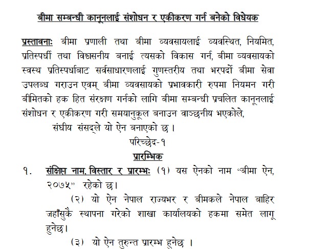 काठमाडौं । अर्थमन्त्रालयले २०६५ साल असारमा संसदमा दर्ता गरेको बीमा ऐनको मस्यौदामा अर्थ समितिको दिल खुस हुने गरी चित्त नबुझेपछि पुनः परिमार्जित गरेर ल्याउन निर्देशन दिइएको छ ।