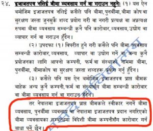 ०७५ को मस्यौदामा ‘नेपालमा इजाजतपत्र पत्र बीमकले स्वीकार नगर्ने बीमा व्यवसाय, पुर्नबीमा व्यवसाय वा नेपालमा इजाजतपत्र प्रदान नगरिएको बीमा व्यवसायका सम्बन्धमा विदेशी बीमा कम्पनीसँग कारोबार गर्न बाधा पर्ने छैन’ दफा २४ (३)मा बाधा फुकाउने नाममा लेखिएको छ।