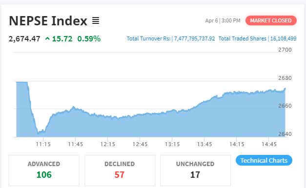 मंगलबार कारोबार सुरु भएको केहि समय तल झरेको नेप्से सूचक अन्तिमसम्ममा १५ दशमलब ७२ अंकले सुधार भएको छ । नेप्से सूचक अहिलेसम्मकै सर्वाधिक २६७४.४७ अंकमा पुगेर रोकिएको छ । नेप्से सूचकले नयाँ रेकर्ड बनाउदा कारोबार रकम भने ७ अर्ब ४७ करोड रुपैयाँको भएको छ । मंगलबार १०६ वटा कम्पनीको मूल्य बढ्दा ५७ वटाको भने घटेको छ ।