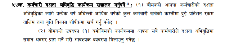यसरी बीमा कम्पनीले कर्मचारीको दक्षता अभिबृद्धि कार्यक्रम सञ्चालन गर्दा सबै कर्मचारीलाई सामान अवसर प्राप्त गर्ने गरी आवस्यक व्यवस्था मिलाउनु पर्नेछ । बीमा कम्पनीले वार्षिक करोडौ रुपैयाँ कर्मचारीका लागि खर्चिने गरेका छन् ।
