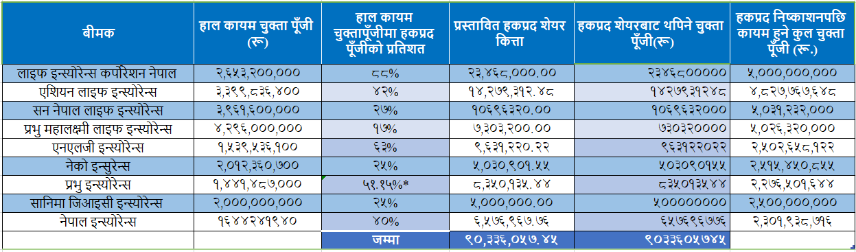 निर्जीवन बीमकमध्ये, एनएलजी इन्स्योरेन्सले ६६ प्रतिशत, नेपाल इन्स्योरेन्सले ४० प्रतिशत, नेको इन्स्योरेन्स र सानिमा जिआइसीले २५ प्रतिशत, प्रभू इन्स्योरेन्सले ५०.१५ प्रतिशत हकप्रद शेयर निष्काशन गर्न लागेको छ ।