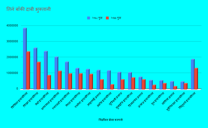 त्यस्तै शिखर इन्स्योरेन्स कम्पनीले २ अर्ब ६० करोड रुपैयाँ दाबी तिर्न बाँकी छ । यस अवधिमा ८५ करोड ३३ लाख रुपैयाँ दाबी भुक्तानी गरेको छ । नेको इन्स्योरेन्स कम्पनीले पनि २ अर्ब ३९ करोड रुपैयाँ दाबी भुक्तानी गर्न बाँकी छ । यस अवधिमा कम्पनीले ५९ करोड ६ लाख रुपैयाँ भुक्तानी गरेको छ ।