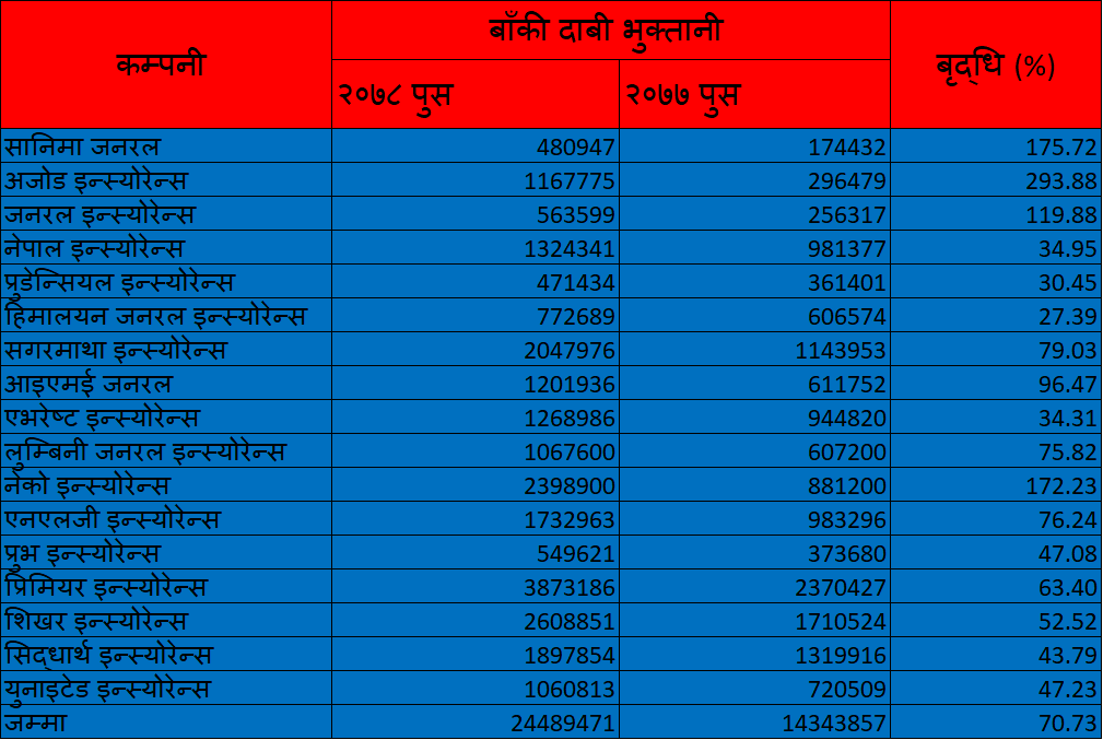 सगरमाथा इन्स्योरेन्सले २ अर्ब ४ करोड रुपैयाँ दाबी तिर्न बाँकी छ । जवकी यस अवधिमा कम्पनीले ७५ करोड ३० लाख रुपैयाँ दाबी भुक्तानी गरेको छ । सिद्धार्थ इन्स्योरेन्स कम्पनीले एक अर्ब ८९ करोड रुपैयाँको दाबी भुक्तानी गर्न बाँकी छ । त्यस्तै सर्वाधिक धेरै दाबी भुक्तानी गर्न बाँकी कम्पनीहरुमा क्रमश एनएलजी इन्स्योरेन्स कम्पनी एक अर्ब ७३ करोड रुपैयाँ, नेपाल इन्स्योरेन्स एक अर्ब ३२ करोड रुपैयाँ, एभरेष्ट इन्स्योरेन्स एक अर्ब २६ करोड रुपैयाँ, आइएमई जनरल एक अर्ब २० करोड रुपैयाँ, अजोड एक अर्ब १६ करोड रुपैयाँ, लुम्बिनी र युनाइटेडको एक अर्ब ६ करोड रुपैयाँ दाबी भुक्तानी गर्न बाँकी छ ।