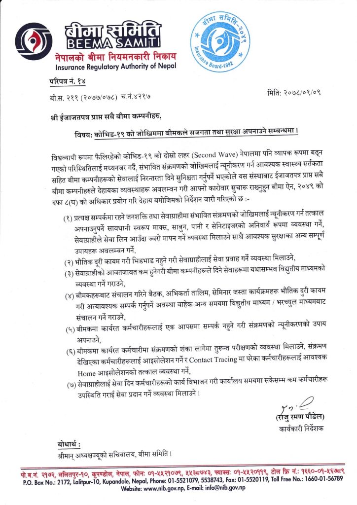 त्यस्तै, भौतिक दुरी कायम गरी भिडभाड नहुने गरी सेवाग्राहीलाई सेवा प्रवाह गर्ने वातावरण मिलाउन, सेवाग्राहीको आवतजावत कम हुने गरी कम्पनीहरुले दिने सेवाहरुलाई यथासक्य विद्युतीय माध्यमका व्यवस्था गर्न समितिले बीमकलाई भनेको छ ।