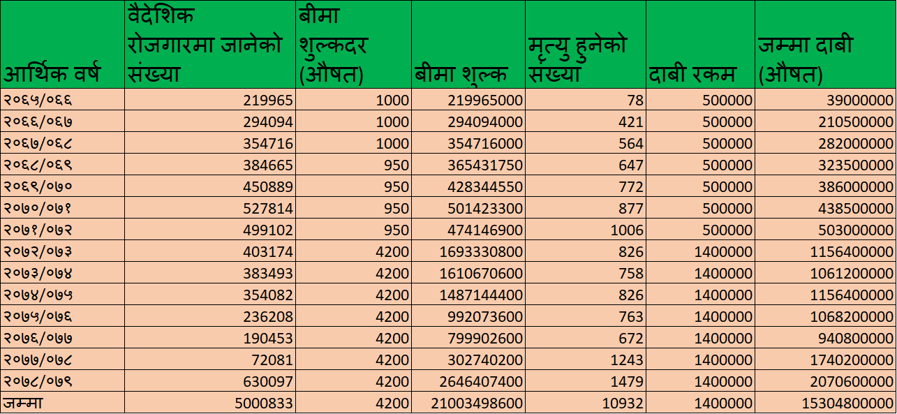 यहि तथ्याङ्कलाई आधार मान्दा बीमा कम्पनीले यस अवधिमा २१ अर्ब भन्दा माथिको बीमा शुल्क संकल्न गरि १६ अर्ब भन्दा माथिको दाबी भुक्तानी गरेको पाइएको छ । यो बीमा योजना २०६४ सालदेखि सुरुवात भएको पाइन्छ । सुरुवाति दिनमै वैदेशिक रोजगारमा गएका नेपालीको मृत्यु भएमा ५ लाख रुपैयाँ मृत्युदाबी भुक्तानी पाउने व्यवस्था थियो । यो व्यवस्था २०७३ माघसम्म कायमै रह्यो ।