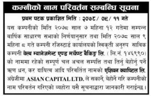 कम्पनीको गत कार्तिक १२ गते सम्पन्न भएको साधारणसभाको निर्णय अनुसार साविक वेल्थ म्यानेजमेन्टको नाममा रहेको सम्पूर्ण चल अचल सम्पत्ती तथा तिर्नु बेहोर्नु पर्ने ऋण धन, कर दायित्व सकार्ने बेहोर्ने निर्णय गरेको थियो । उक्त दायित्व सकार्नुका साथै नाम पनि परिवर्तन गर्ने निर्णय गरेको थियो । सोही निर्णय अनुसार कम्पनीले पुस ८ गते कम्पनी रजिस्टार्ड कार्यालयबाट नाम परिवर्तनको स्वीकृति पाएको थियो ।