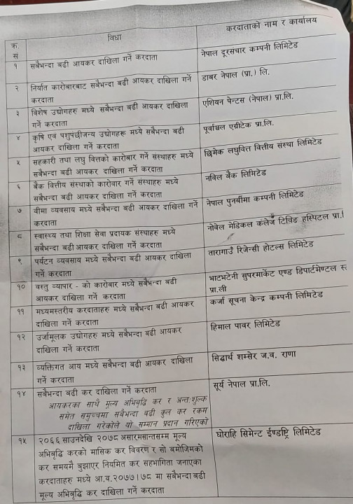 लघुवित्त वित्तीय संस्थाहरुको तर्फ छिमेक लघुवित्त वित्तीय संस्था, वाणिज्य बैंक तर्फ नबिल बैंकले सर्वाधिक कर बुझाए बापत सम्मानित भएका हुन् । सेवा तर्फबाट नोबेल हस्पिटल, पर्यटनबाट तारागाउँ रिजेन्सी(ह्यात) सम्मानित भएको छ । त्यस्तै भाटभटेनीले पनि धेरै तिरेबापत सम्मानित भएको हो । हाइड्रोपावरको तर्फबाट हिमाल पावर कम्पनीले सम्मान पाएको छ ।
