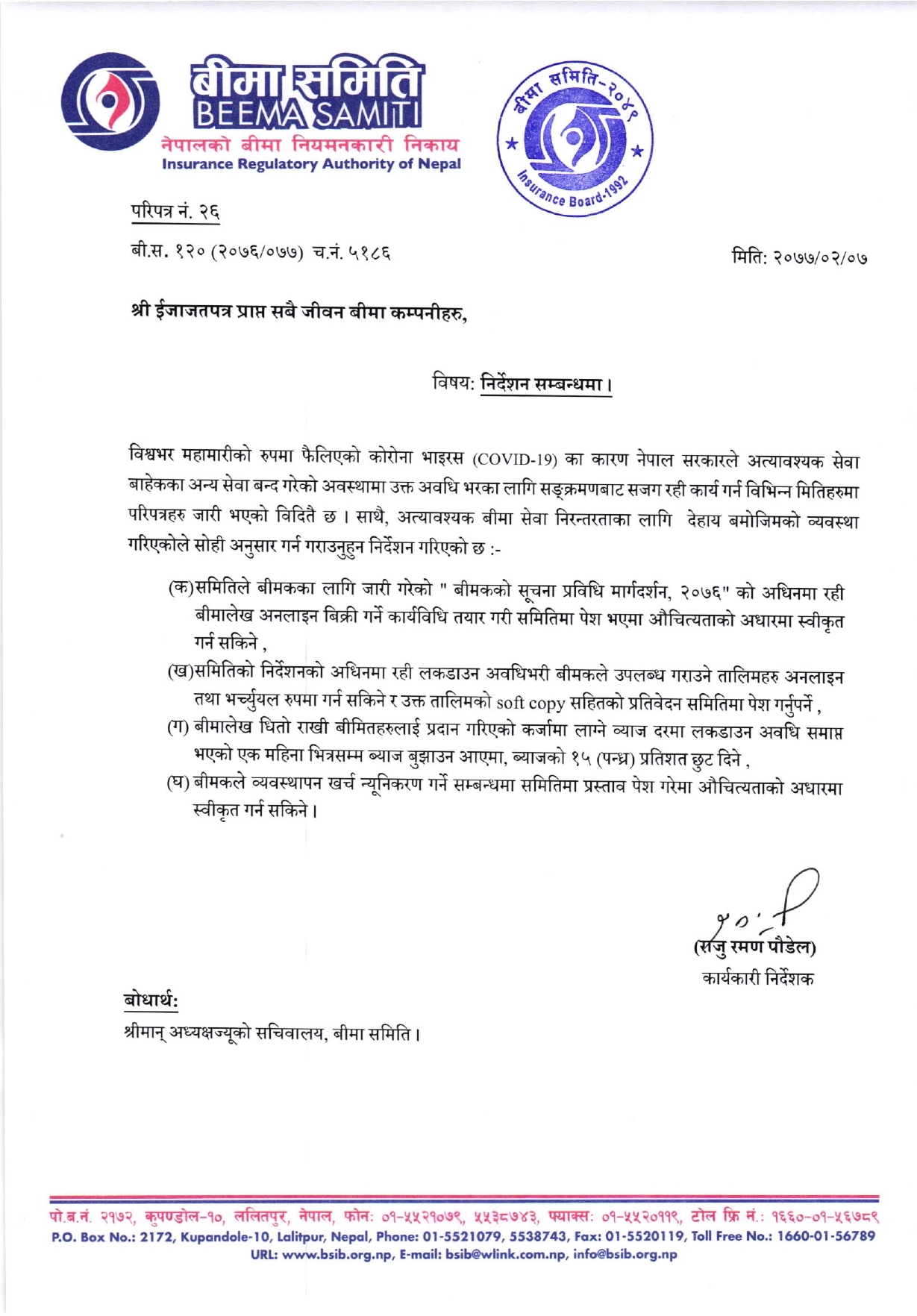 त्यस्तै बीमा समितिका कार्यकारी निर्देशक राजु रमण पौडेलले आजै जारी निर्देशनमा बीमा कम्पनीहरुले गर्न तालिमहरु अनलाईनमार्फत आयोजना गर्न सक्ने गरी व्यवस्था गरेको जनाइएको छ । त्यस्तै, बीमकले व्यवस्थापन खर्च घटाउने सम्बन्धी कुनै योजना बनाएर पेश गरेमा बीमा समितिले स्वीकृत गर्नसक्ने जनाएको छ । त्यस्तै, बीमकको सूचना प्रविधि मार्गदर्शन २०७६ बमोजिम अनलाईनबाटै बीमालेख बिक्री गर्न चाहेमा बीमा समितिले अनुमति दिनसक्ने जनाइएको छ ।