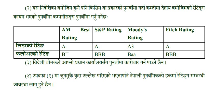 पूनर्बीमा निर्देशिका २०७८ मा जाेखिम हस्तान्तरणकाे लागी अगुवा विदेशी पूनर्बीमककाे छनाैट गर्दा एएम बेष्ट, एस एण्ड पि र फिच रेटिङबाट ए माइनस वा मुडिजबाट ए थ्री रेटिङ प्राप्त पूनर्बीमकसँग मात्र पूनर्बीमा गर्नुपर्ने प्रावधान रहेकाे छ । त्यसैगरी सहायक पूनर्बीमककाे हकमा एएम बेष्टबाट बी प्लसप्लस, , एस एण्ड पि र फिच रेटिङबाट त्रिपल बी र मुडिजबाट बिडबलए रेटिङ प्राप्त पूनर्बीमकसँग हुनुपर्ने प्रावधान छ । स्वदेशी पूनर्बीमककाे हकमा रेटिङ अनिवार्य गरिएकाे छैन ।