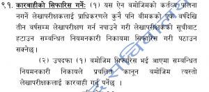 प्रस्ताविक विद्येयकको दफा ९१ को उपदफा १ मा ऐन बमोजिम कर्तब्य पालना नगर्ने लेखापरीक्षकलाई प्राधिकरणले कुनै पनि बीमकको एक बर्ष देखि तीन बर्षसम्म लेखापरीक्षण गर्न नपाउँने गरी लेखापरीक्षकको सूचीबाट हटाउन सम्बन्धित नियमनकारी निकायमा सिफारिश गरी पठाउन सक्ने व्यवस्था गरेको छ । उपदफा २ मा सिफारिस भई आएमा सम्बन्धित नियमनकारी निकायले प्रचलित कानून बमोजिम त्यस्तो लेखापरीक्षकलाई कारवाही गर्नुपर्नेछ । विद्यमान ऐनमा भने कारवाहीको व्यवस्था गरिएको छैन ।