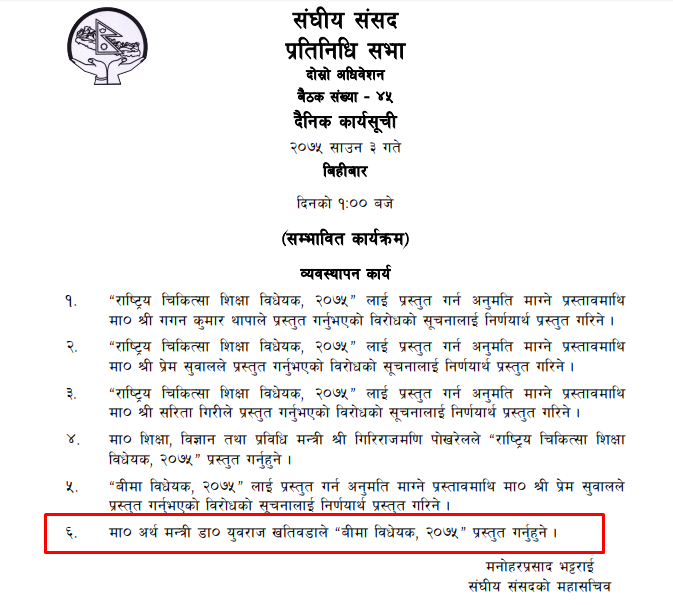 इन्स्योरेन्स खबर/काठमाडौँ: साउन ३ गते विहीबार बीमा विद्येयक २०७५ संघीय संसदमा प्रस्तुत हुने भएको छ । विद्ययेक यस अघि नै मन्त्री परिषदवाट पारित भएर संसदमा दर्ता भइसकेको छ । बीमा ऐन लागु भएपछि बीमा समिति नेपाल बीमा प्राधिकरणमा रुपान्तरण हुने छ। विधेयक पास भएमा हालको बीमा समितिको कार्यकाल समाप्त हुनेछ।