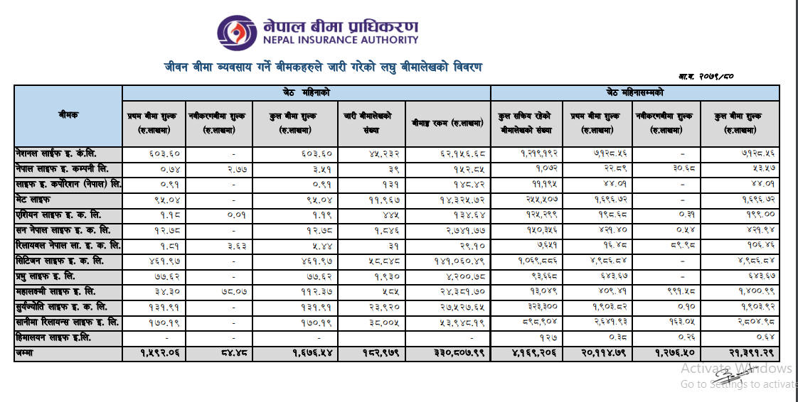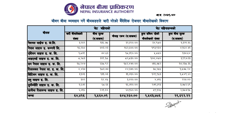 चालु आर्थिक वर्षको जेठ महिनासम्ममा जीवन बीमा कम्पनीहरुले २५ अर्ब ९५ करोड रुपैयाँ बीमा शुल्क आर्जन गरेका छन् । यहि अवधिमा लघु बीमालेख मार्फत २ अर्ब १३ करोड रुपैयाँ बीमा शुल्क आर्जन गरेका छन् भने वैदेशिक रोजगार बीमालेख मार्फत २ अर्ब ९६ करोड रुपैयाँ आर्जन गरेका छन् ।