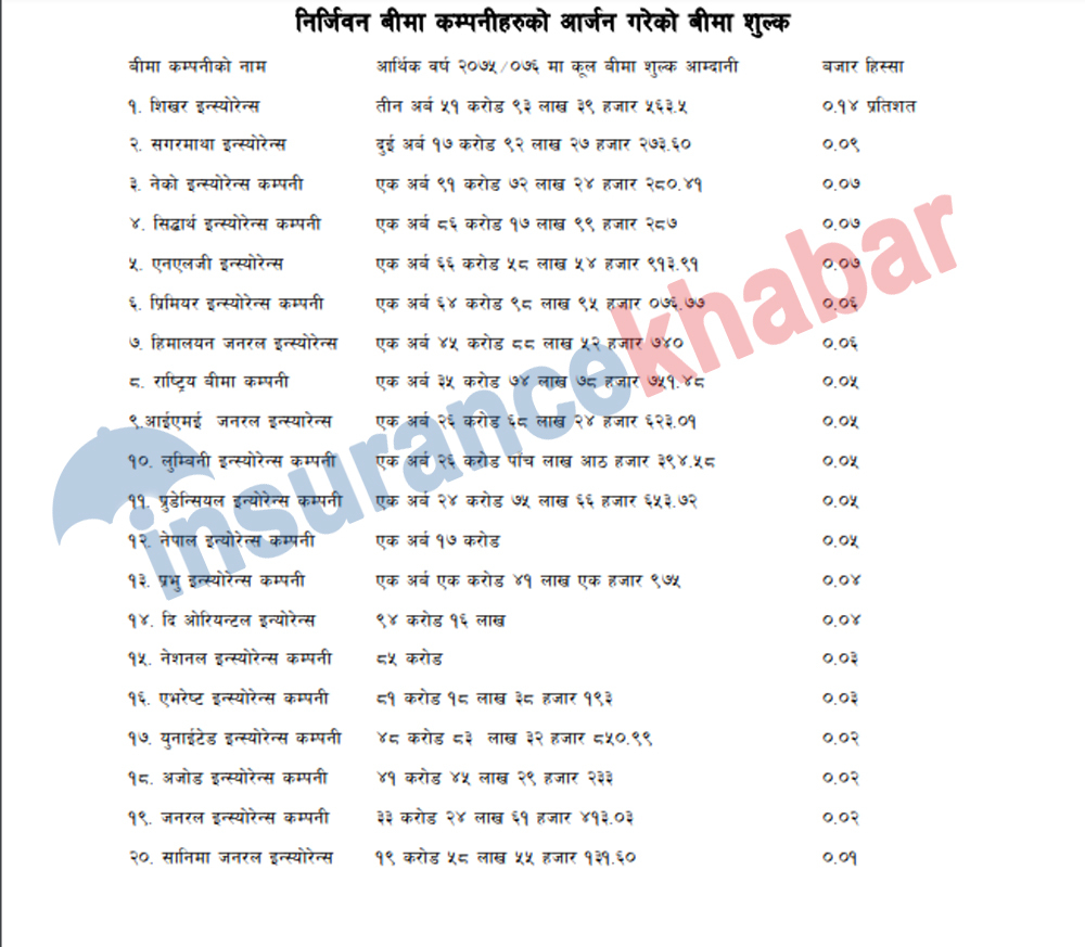 आर्थिक वर्ष २०७५/०७६ मा निर्जिवन बीमा कम्पनीहरुले संकलन गरेको कूल बीमा शुल्कको आधारमा शिखर इन्स्योरेन्स कम्पनी पहिलो बनेको छ भने सानिमा जनरल इन्स्योरेन्स कम्पनी अन्तिम बनेको छ । शिखर इन्स्योरेन्स कम्पनीले कूल तीन अर्ब ५१ करोड ९३ लाख ३९ हजार ५६३ रुपैयाँ बीमा शुल्क संकलन गरी यस वर्ष पनि पहिलो नम्बरमा राख्न सफल भएको हो ।