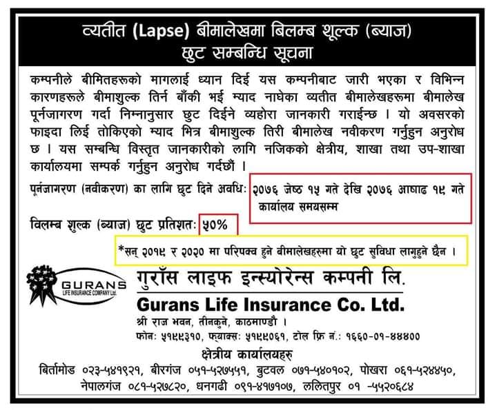 गुराँस लाइफ इन्स्योरेन्स कम्पनी लिमिटेडले अबसरमा बीमितहरुलाई बीमालेख नबिकरण गर्न छुटेकालाई जेठ १५ गते देखि २०७५ अषाढ १८ तले ब्यतित बीमालेखको लागि बीमाशुल्कमा लाग्ने ब्याजमा ५० प्रतिशत ब्याज छुट प्रदान गर्ने कम्पनीले जानकारी दिएको छ।