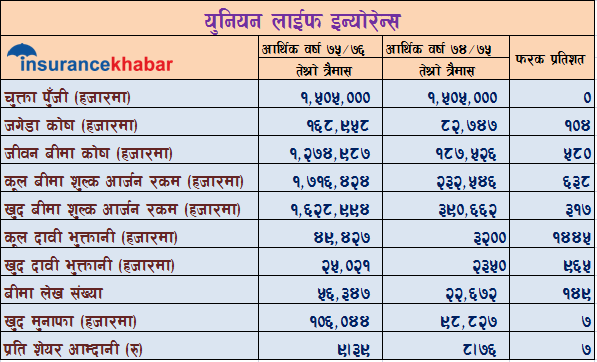 युनियन लाईफ इन्स्योरेन्सले आर्थिक वर्ष ७५/७६ को तेश्रो त्रैमासको वित्तिय विवरण सार्वजनिक गरेको छ । नयाँ जीवन बीमा कम्पनी मध्य आक्रामक रुपमा युनियन लाईफ इन्स्योरेन्स अघि बढेको छ। छोटो समयमै जीवन बीमा कोषको आकारलाई १ अर्ब माथि पुर्याउन कम्पनीको ठुलो सफलता रहेको छ।