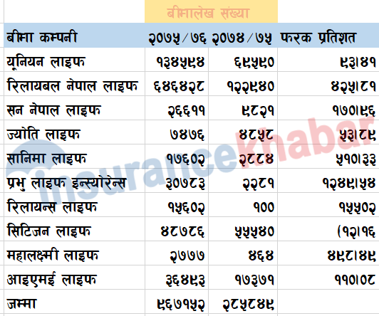 आर्थिक वर्ष २०७५/७६ को चौथो त्रैमासको अवधिमा बीमालेख संख्याको आधारमा रिलायबल नेपाल लाईफ इन्स्योरेन्स अगाडी छ । चौथो त्रैमासको अवधिमा रिलायबल नेपाल लाईफ इन्स्योरेन्समा ६ लाख ४६ हजार ४ सय २८ कुल बीमा लेख संख्या कायम छन् । त्यस्तै दोश्रोमा युनियन लाईफ इन्स्योरेन्स पर्दछ । युनियन लाईफ इन्स्योरेन्समा हाल सम्म एक लाख ३४ हजार ५९४ कुल बीमालेख संख्या कायम छन् । त्यस्तै, तेश्रोमा सिटिजन्स लाईफ इन्स्योरेन्स पर्दछ । सिटिजन्स लाईफ इन्स्योरेन्समा हाल सम्म ४८ हजार ७ सय ८६ बीमा लेख संख्या कायम छन् । उल्लेखित जारी बीमालेखको संख्यामा म्यादी बीमाको कारण संख्यामा प्रभावित भएको हुनसक्ने देखिएको छ ।