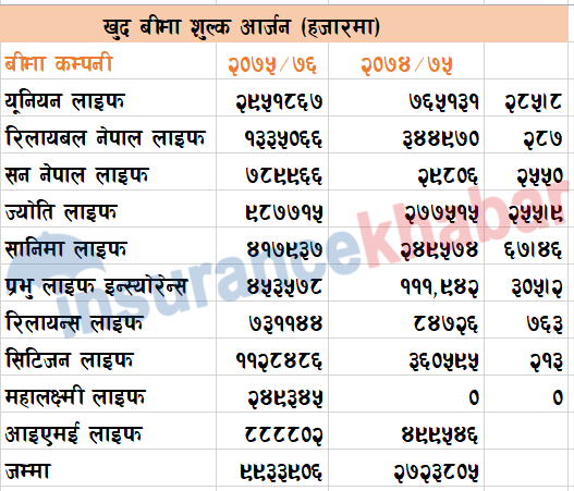 आर्थिक वर्ष २०७५/७६ को चौथो त्रैमासको अवधिमा सबै भन्दा धेरै बीमा शुल्क आर्जन गर्ने कम्पनी युनियन लाइफ इन्स्योरेन्स रहेको छ । युनियन लाइफ इन्स्योरेन्सले आर्थिक वर्ष २०७५/७६ को चौथो त्रैमासको अवधिमा कम्पनीले दुई अर्ब ९५ करोड १८ लाख ६७ हजार रुपैयाँ खुद बीमा शुल्क आर्जन गर्न सफल भएको छ ।