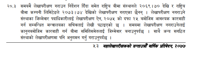 महालेखाको ५७ औं बार्षिक प्रतिवेदनमा राष्ट्रिय बीमा संस्थानले आव २०६९।०७० देखि लेखा परिक्षण नराएको भन्दै सो कम्पनीका जिम्मेवार पदाधिकारीहरुलाई कारवाही गर्न अर्थमन्त्रालयलाई पत्राचार गरिएको हो । त्यस्तै राष्ट्रिय बीमा कम्पनीले २०७३।०७४ देखि यताको लेखा परिक्षण नगरेको भन्दै सो कम्पनीका जिम्मेवारी पदाधिकारीहरुलाई कारवाही गर्न अर्थमन्त्रालयका सचिवलाई पत्र लेखिएको महालेखा परिक्षकको कार्यालयले जनाएको छ ।