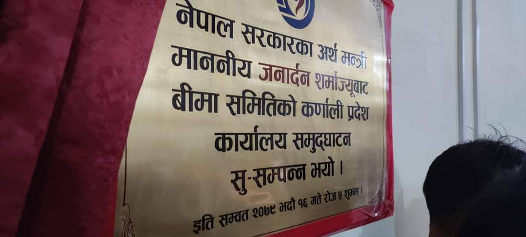 काठमाडौं । अर्थमन्त्री जनार्दन शर्माले बीमा समितिको कर्णाली प्रदेश कार्यालय उद्घाटन गरेका छन् । बीमा समितिले एक भव्य कार्यक्रमका विचमा पहिलो प्रादेशिक कार्यालयको शुभारम्भ गरेको छ । समितिले गत असार एक गतेदेखि नै उपनिर्देशक पदम सोडारीको नेतृत्वमा कार्यालय सञ्चालनमा ल्याएको थियो । तर औपचारिक रुपमा भने आजदेखि शुभारम्भ भएको छ ।