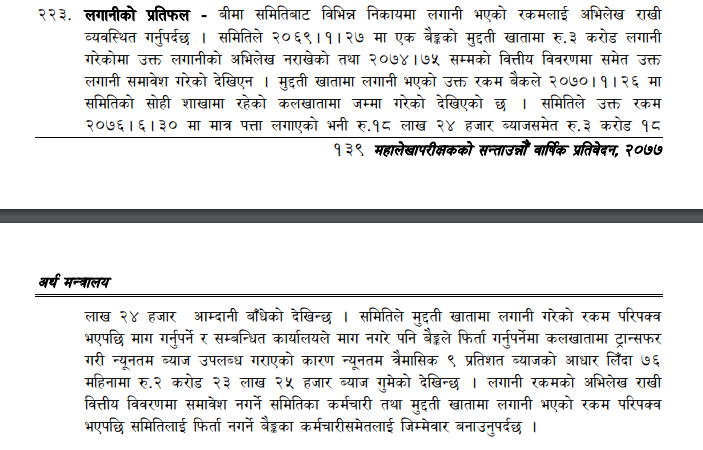 महालेखा परिक्षकको कार्यालयले मुद्दति निक्षेपमा राख्नुपर्ने रकम सामान्य कल खातामा रकमान्तर गरी न्यून ब्याज दिइएको र सो अवधीको समानुपातिक ब्याज हिसाब गर्दा दुई करोड २३ लाख २५ हजार रुपैयाँ बीमा समितिलाई आर्थिक क्षति भएको उल्लेख छ ।
