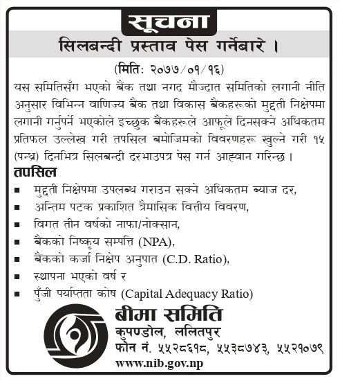 काठमाडौं । बीमा समितिले विभिन्न कोषमा रहेको रकम मुद्दति निक्षेपमा राख्नका लागि बैंकहरुलाई प्रस्ताव पेश गर्न आह्वान गरेको छ । मुद्दति निक्षेप लिन इच्छुक वाणिज्य तथा विकास बैंकलाई बोलपत्र आह्वानमा सहभागी हुन भनेको छ । समितिले वाणिज्य बैंक र विकास बैंकसँग सूचना जारी भएको १५ दिन सम्ममा गोप्य शिलबन्दी फारम बुझाउन आह्वान गरेको छ ।