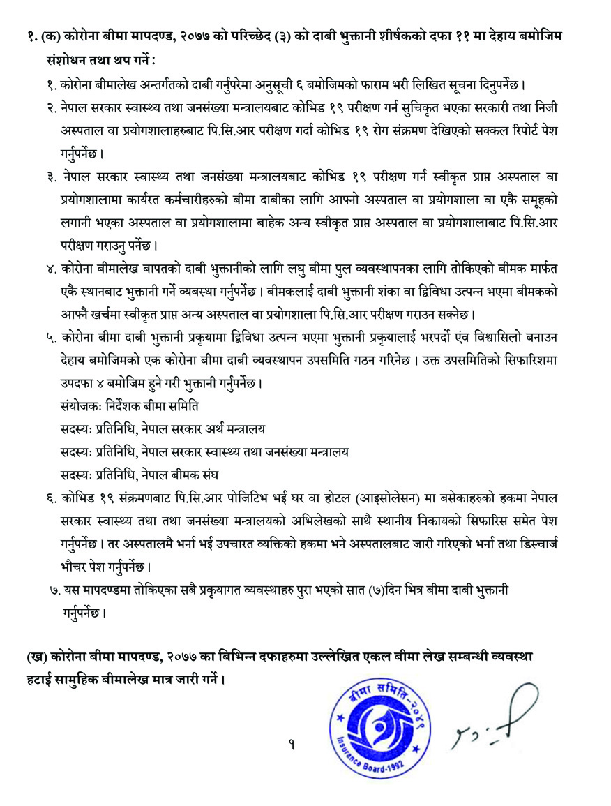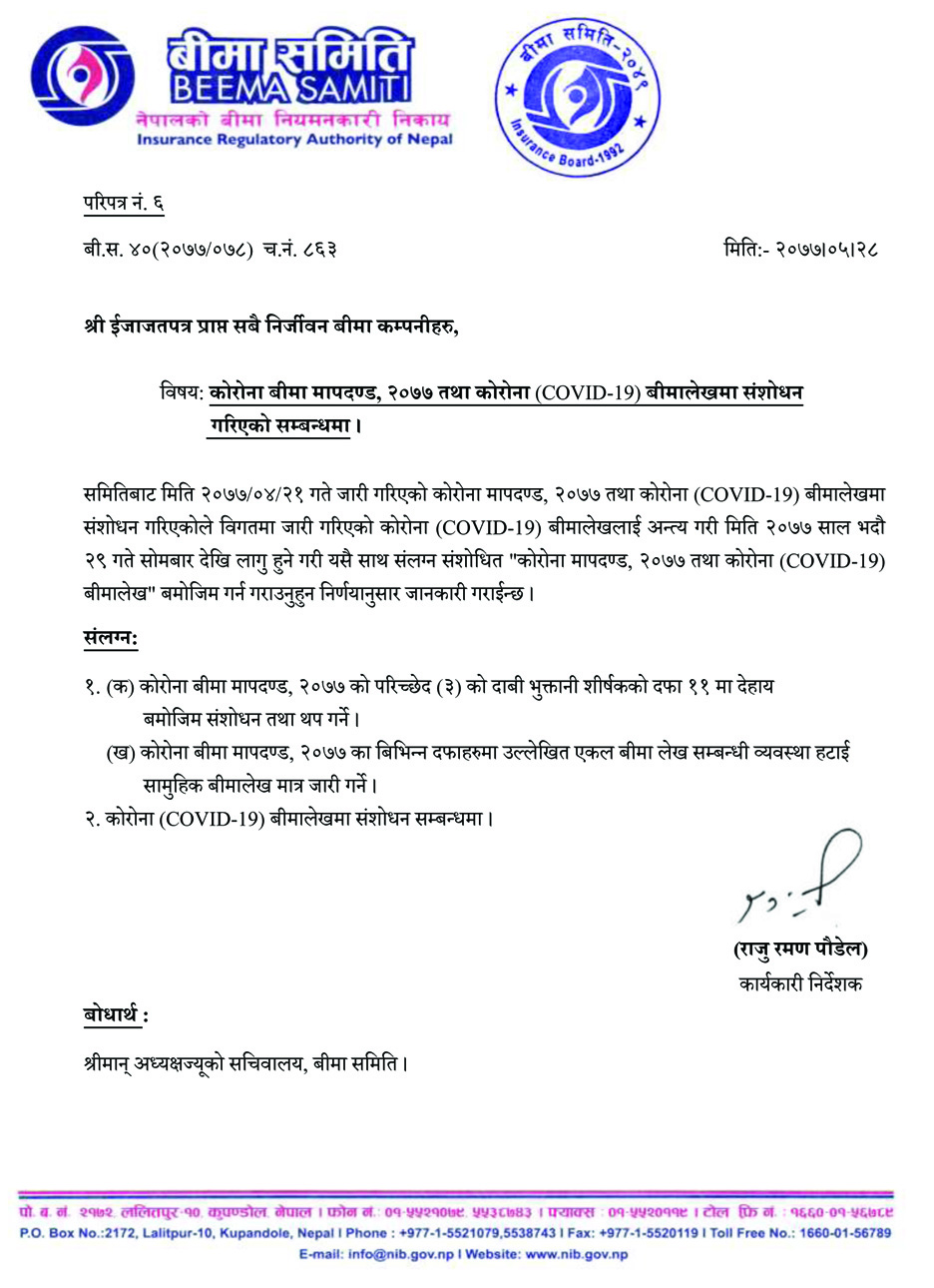 त्यसैगरी, कोरोना बीमा पोलिसीमा पनि संशोधन गरिएको छ । बीमा पोलिसी अब व्यक्तिगत रुपमा खरिद गर्न पाइने छैन । पारिवारिक मात्रै खरिद गर्न पाइने व्यवस्था गरिएको छ । इन्स्योरेन्स खवरले कोरोना बीमा पोलिसी त्रुटीपूर्ण रहेको समाचार प्रकाशन गरेको थियो ।