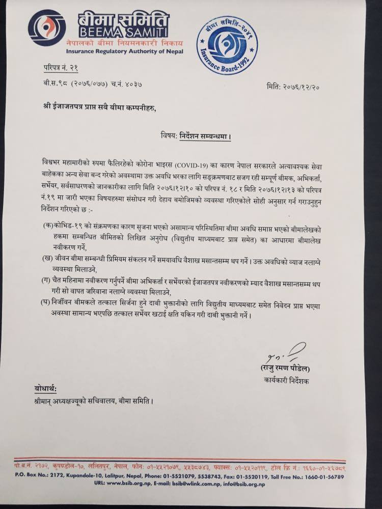 त्यसैगरी, बीमितिले बीमा नविकरणको लागि लिखित रुपमा विद्युतीय माध्यमबाट समेत अनुरोध भई आएमा बीमा पोलिसी नविकरण गर्ने व्यवस्था मिलाउन निर्देशन दिएको छ ।