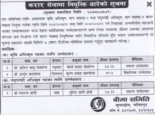 समितिले असोज १८ र १९ गते लिइएको अन्तर्वार्तामा सहभागी भएका उमेद्दवारहरु मध्ये दुई जनालाई छनोट गरेको हो । उनिहरुलाई सात दिन भित्रमा समितिमा सम्पर्क गर्न अनुरोध गरिएको छ । बीमा समितिले कृषि तथा पशुपन्छीबीमालाई थप व्यवस्थित गर्न दुई प्राविधिकहरुलाई नियुक्त गरेको हो ।