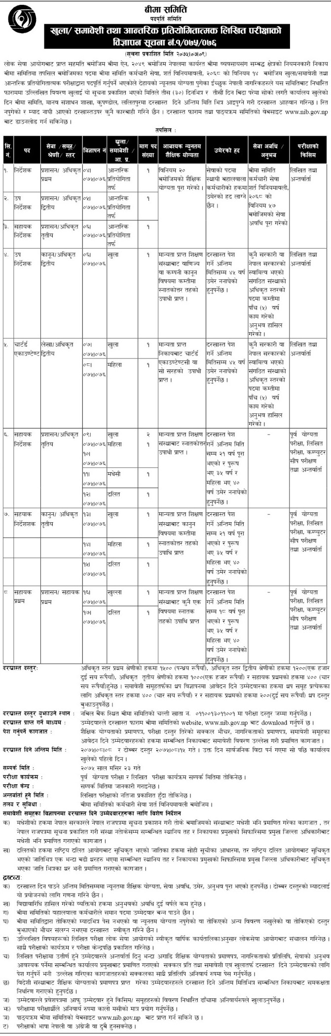 ईच्छुक एवंम योग्यता पुगेका नेपाली नागरिकहरुले यस समिति बाट निर्धारित फाराममा उल्लिखित विवरणहरु खुलाई यो सुचना प्रकाशित भएको मितिले ३० दिन भित्र बीमा समिति, मानव संशाधन शाखा कुपण्डोल, ललितपुरमा दरखास्त दिने अन्तिम मिति भित्र आई पुग्ने गरि दरखास्त दिई सक्नु पर्ने समितिले जनाएको छ ।