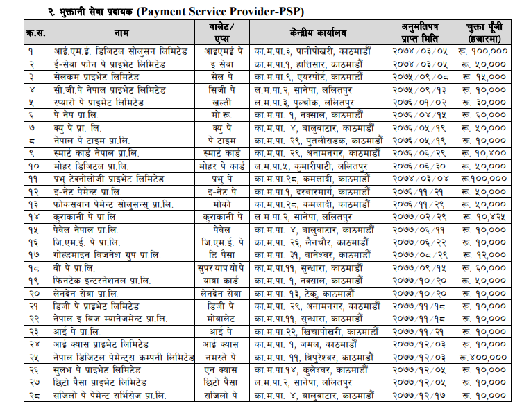 हाल नेपाल राष्ट्र बैंकले २८ वटा संस्थालाई भुक्तानी सेवा प्रदायको लाइसेन्स दिएको छ । आइएमई पे, इसेवा, सेल पे, प्रभु पे जस्ता भुक्तानी सेवा प्रदायकले खुद्रे भुक्तानी तथा कारोबारलाई सहज बनाइदिएको छ । कतिपय बीमा समितिले पनि यस्ता भुक्तानी सेवा प्रदायकलाई आफ्नो प्रणालीमा आवद्ध गरेर भुक्तानी प्रणालीलाई सहज बनाइरहेका छन् ।