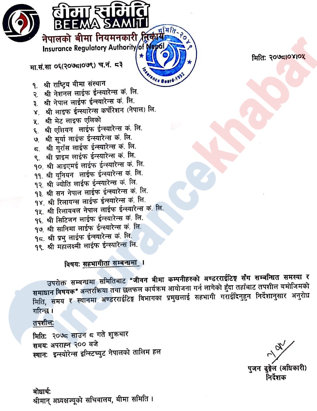 समितिले सम्पुर्ण जीवन बीमा कम्पनीको अण्डरराइटिङ विभागका प्रमुखहरुलाई ‘अण्डरराईटिङ सँग सम्बन्धित समस्या र समाधान विषयक’ अन्तर्क्रियात्मक तालिममा सहमागि हुने निर्देशन दिएको छ । जीवन बीमा क्षेत्रमा अण्डराइटिङ सबैभन्दा महत्वपुर्ण विभाग हो । यदि कम्पनीहरुले राम्रो सँग अण्डराइटिङ गर्न सकेनन् भने धेरै दाबी पर्ने तथा फ्रडका घटना बढ्न सक्छन् ।