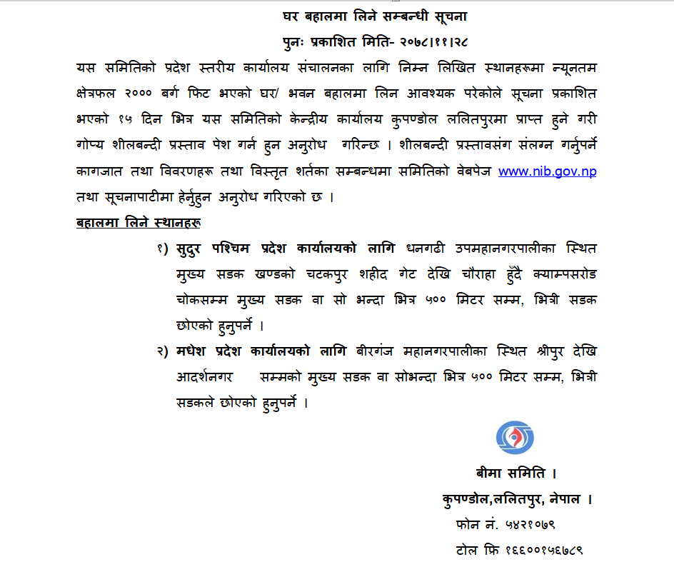 काठमाडौं । बीमा समितिले प्रादेशिक कार्यालय स्थापनाका लागि सुदुर पश्चिम प्रदेश र मधेस प्रदेशमा भाडाको घर पाउन सकेको छैन । समितिले फागुन २ सुदूरपश्चिमको धनगढी, कर्णाली प्रदेशको सुर्खेत र मधेश प्रदेशको वीरजञ्जमा प्रादेशिक शाखा कार्यालय स्थापनाका लागि घरधनीहरु प्रस्ताव आह्वान गरेको थियो ।