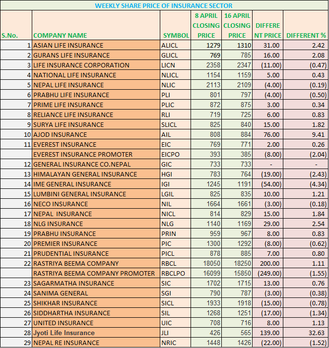 यस साता नेप्से सूचक अहिलेसम्मकै धेरै २७३५ अंक पुगेको छ । सूचकमा सुधार सँगै बजार पूँजीकरण पनि अहिलेसम्मकै सबैभन्दा धेरै ३७ खर्ब ८७ अर्ब रुपैयाँ कायम भएको छ । यस साताको अन्तिम दिन अधिकाम्स बीमा कम्पनीको शेयर मूल्यमा सुधार देखिए पनि साप्ताहिक रुपमा हेर्ने हो भने १३ वटा बीमा कम्पनीको शेयर मूल्य घटेको छ । त्यस्तै १६ वटा कम्पनीको शेयर मूल्यमा भने सुधार देखिएको छ ।
