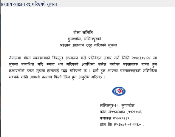 काठमाडौं । बीमा समितिले नेपालमा बीमा व्यवसायको विस्तृत अध्यय गरि प्रतिवेदन तयारका लागि विभिन्न संस्थाहरु सँग प्रस्ताव आह्वान गर्दा एउटा पनि उपयुक्त आवेदन नपरेपछि प्रस्ताव आह्वान नै रद्द गरेको छ ।