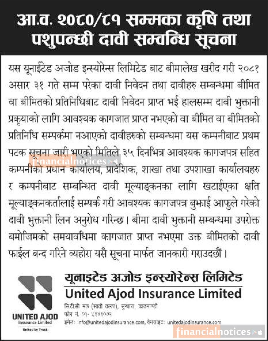 २०८१ असार ३१ गतेसम्म परेका दाबीहरुको बीमा दाबीको निवेदन कम्पनीमा पेश गरेको तर, पेश गरिएको कागजात अपुग रहेको हुनाले बीमित तथा बीमितिका प्रतिनिधिलाई सम्पर्कमा आई दाबी भुक्तानी प्रक्रिया अघि बढाउन कम्पनीले आग्रह गरेको हो ।