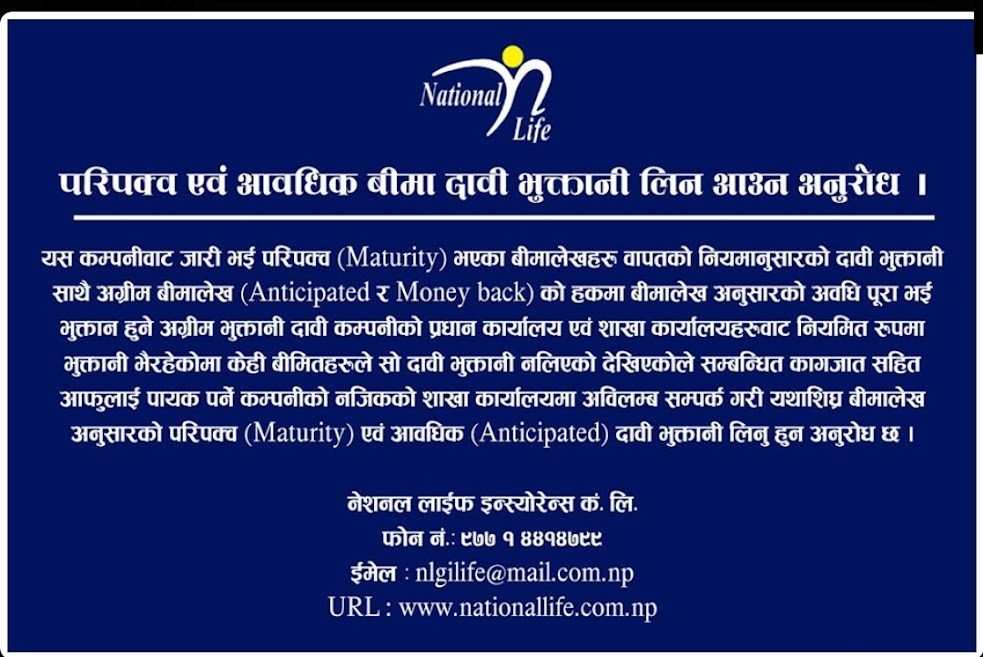 काठमाडौं । नेशनल लाइफ इन्स्योरेन्स कम्पनी लिमिटेडले परिपक्व तथा आवाधिक बीमा भुक्तानी लिन आउन आग्रह गरेको छ । कम्पनीले एक सुचना जारी गर्दै बीमा पोलिसी परिपक्व भएका तथा आवाधिक बीमा दाबी भुक्तानी लिन आफ्ना बीमितहरुलाई आग्रह गरेको हो ।