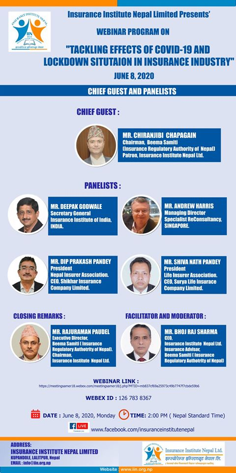 कार्यक्रममा नेपाल इन्स्योरेन्स इन्स्टीच्यूटका अध्यक्ष तथा बीमा समितिका कार्यकारी निर्देशक राजुरमण पौडेलले कोरोना भाइरसको महामारीले बीमा क्षेत्रमा पीडादायी असर पर्ने बताए । कोरोना महामारीका कारण नयाँ बीमा व्यवसाय लगभग ठप्प नै भएको छ । नविकरण कठिन अवस्थामा पुगेको बताए । जटिल अवस्थामा पनि बीमा कम्पनीहरुले सेवा प्रवाहको अधिकतम प्रयासहरु गरिरहेको बताए । आईआईएनका अध्यक्ष पौडेलले भने, ‘बीमा समितिको मुख्य चासो व्यवसाय प्रबद्र्धन नै हो । लघु बीमा, कृषि बीमालाई प्रोत्साहन छ । साथै विद्युतीय माध्यमबाट बीमा व्यवसाय गर्न प्रोत्साहन गरिरहेका छौं ।’ उनले नियमनकारी निकाय हुनुको नाताले बीमा समिति अवस्थामा सुक्ष्म निगरानी गरिरहेको समेत बताए ।