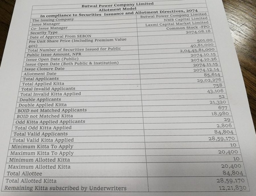 २८ लाख ५९ हजार एक सय ७० कित्ता एफपीओका लागि ८४ हजार ८ सय ४ जनाको आवेदन सदर भएको थियो । ती सबैले सेयर पाएका छन् । बाँकी १२ लाख २१ हजार ८ सय ३० कित्ता भने अण्डर राइटरले खरिद गरेका छन् । ५०१ रुपैंयाँ एफपीओ जारी गरेको बुटवल पावर कम्पनीको सेयर मूल्य भने ४६८ रुपैंयाँमा झरिसकेको छ ।